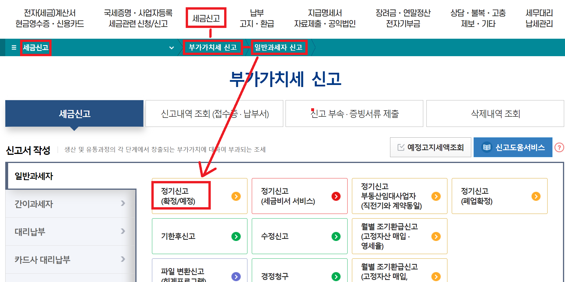 > "세금신고 > 부가가치세 신고 > 일반과세자 신고 > 정기 신고" 로 들어 간다